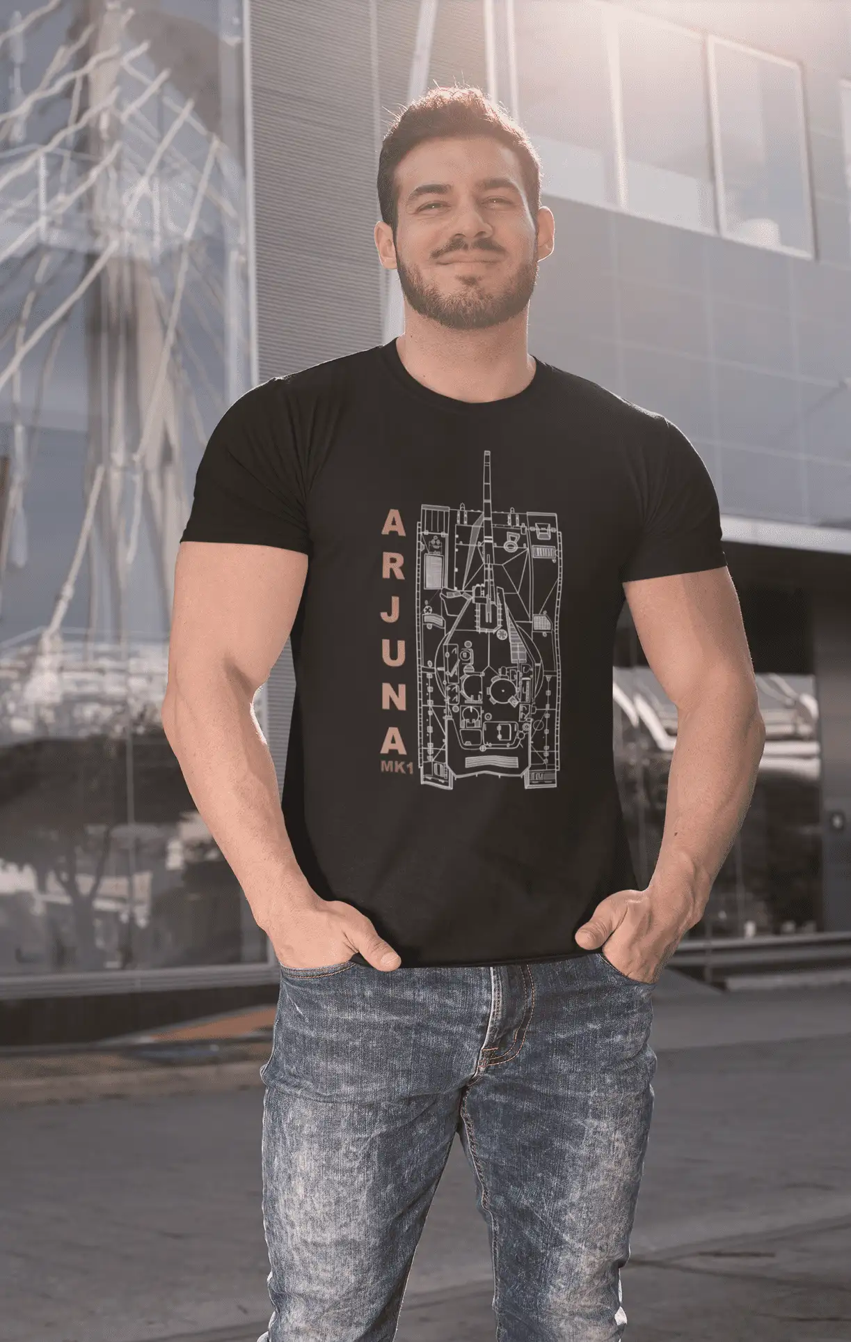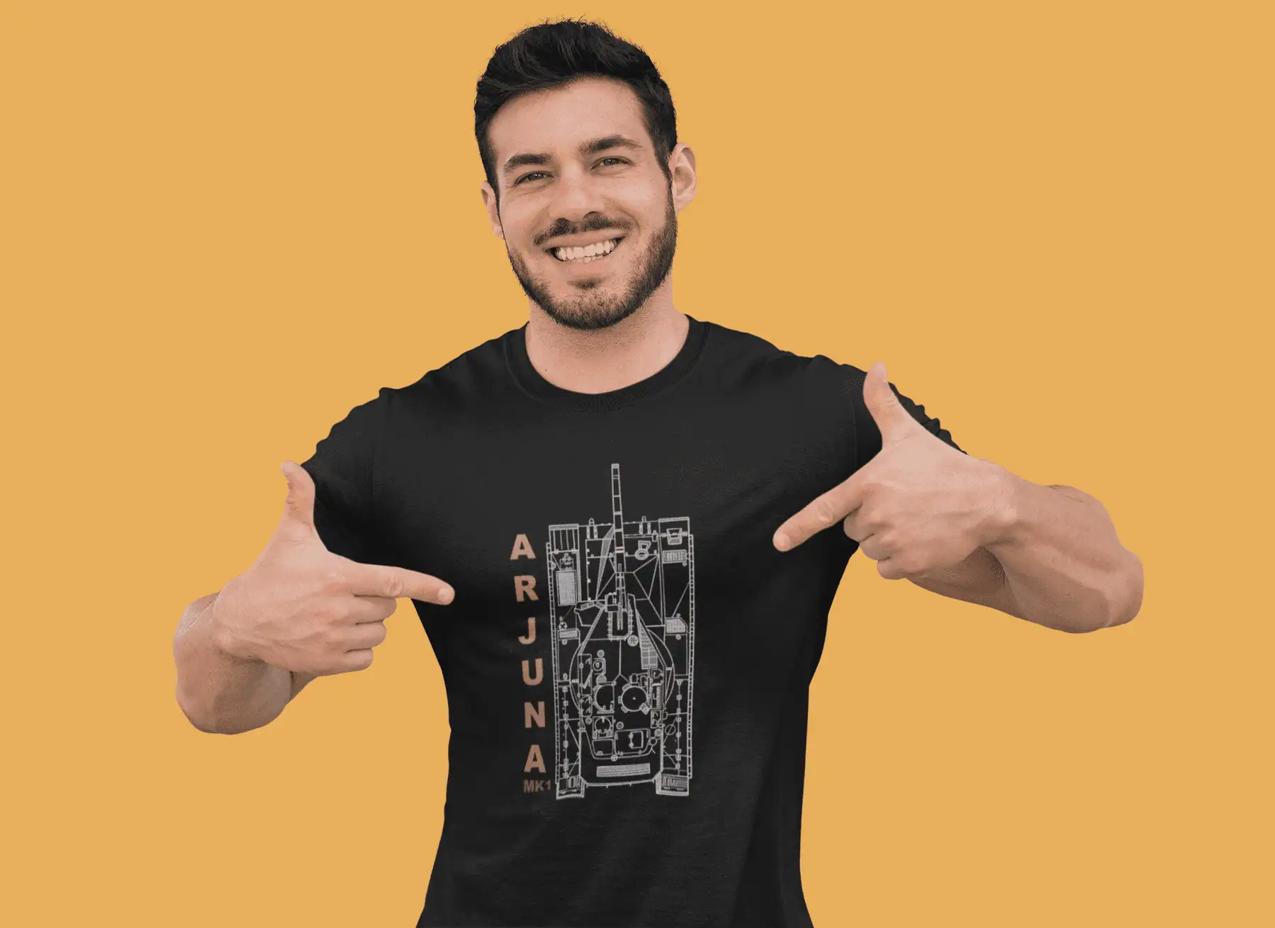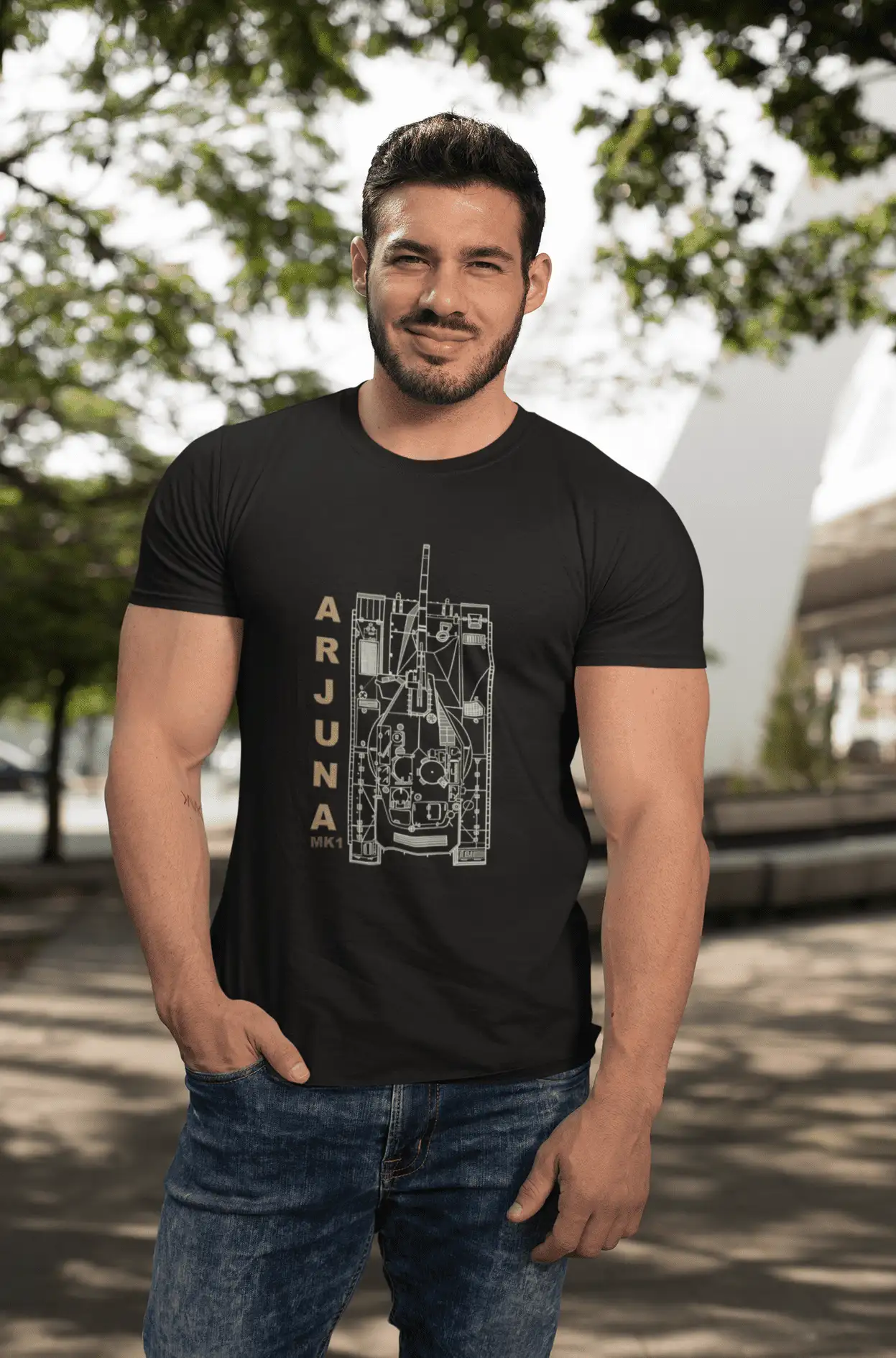 Salute Indian engineering excellence with this bold black classic fit crew neck t-shirt, showcasing the top-down blueprint artwork of the Arjun Mk1, India’s indigenous main battle tank. The clean, technical line art paired with vertically stacked “ARJUN MK1” text gives the tee a striking military x streetwear edge.