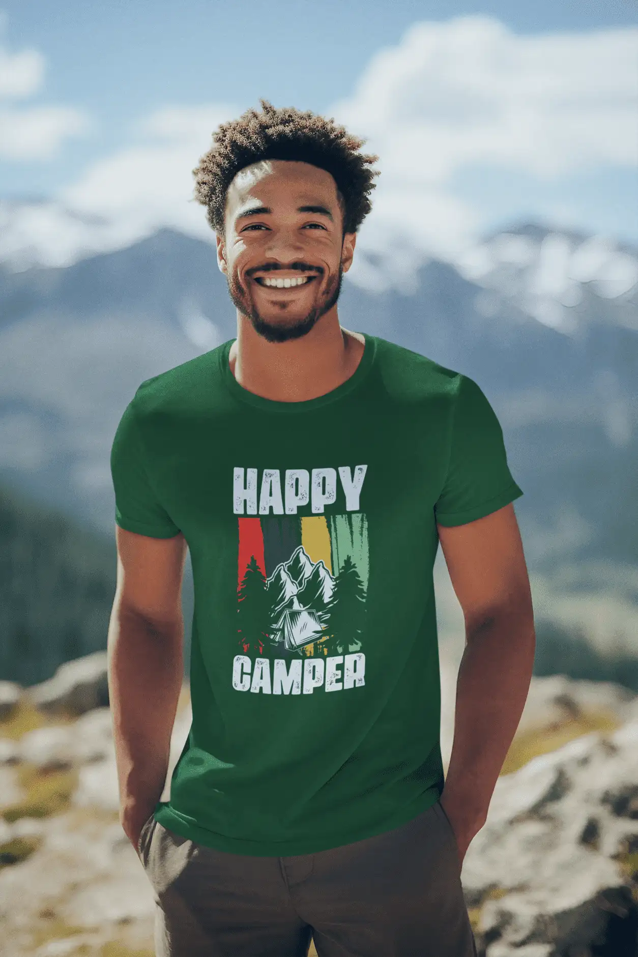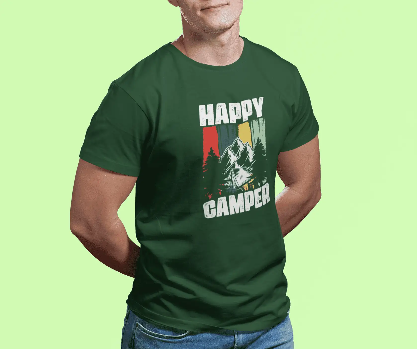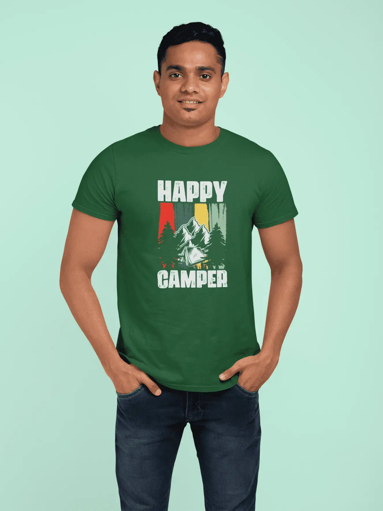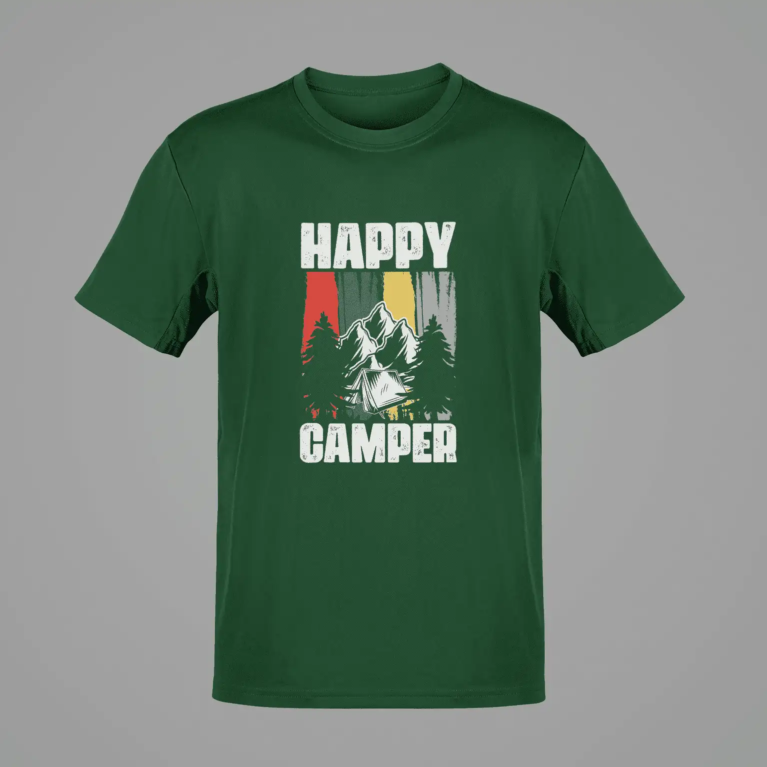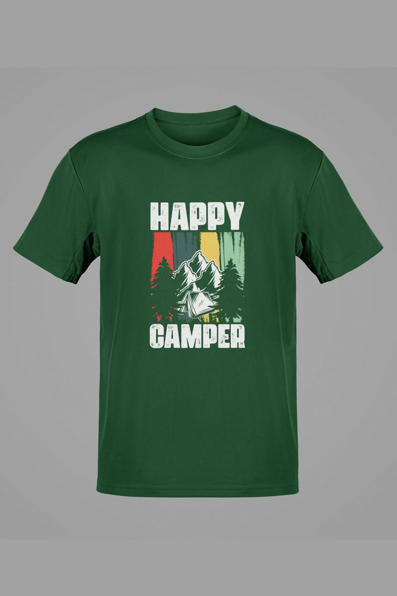 Channel pure campsite joy with this bottle green classic-fit t-shirt featuring a bold “Happy Camper” slogan and striking mountain tent scene. With rugged trees, snowy peaks, and grungy vertical stripes in red, green, yellow, and teal – this tee blends wilderness vibes with retro attitude for nature lovers who wear their joy on their sleeve.