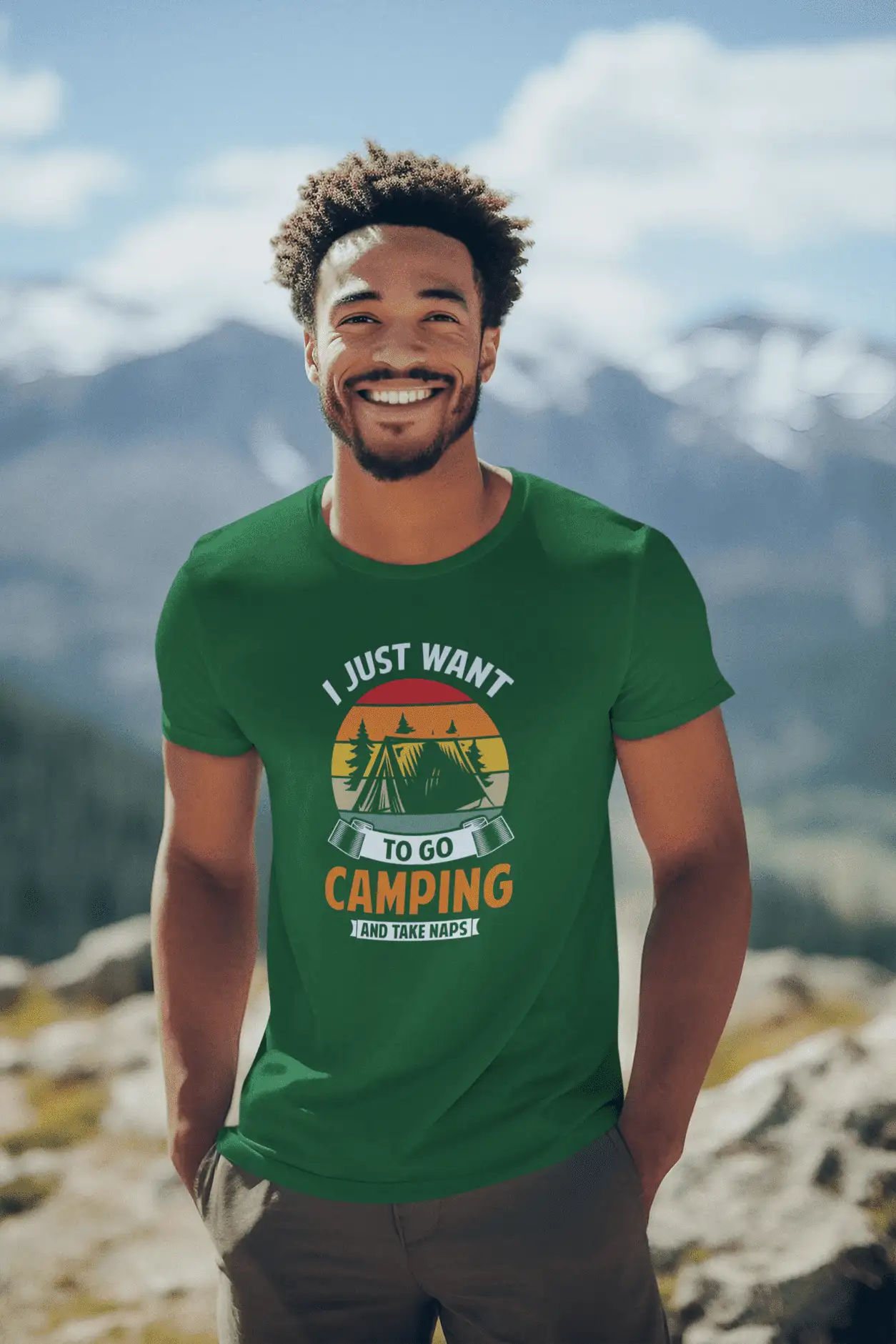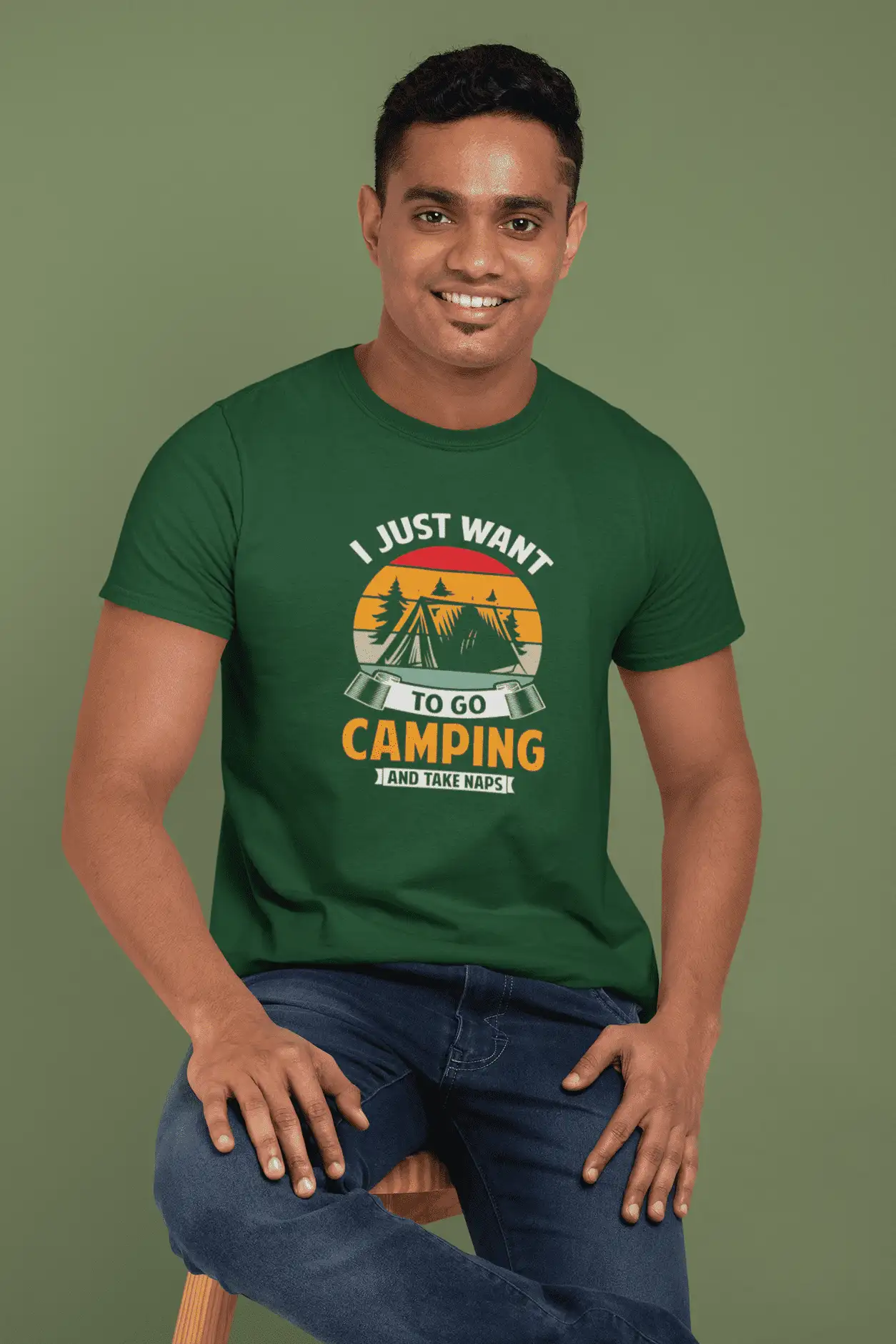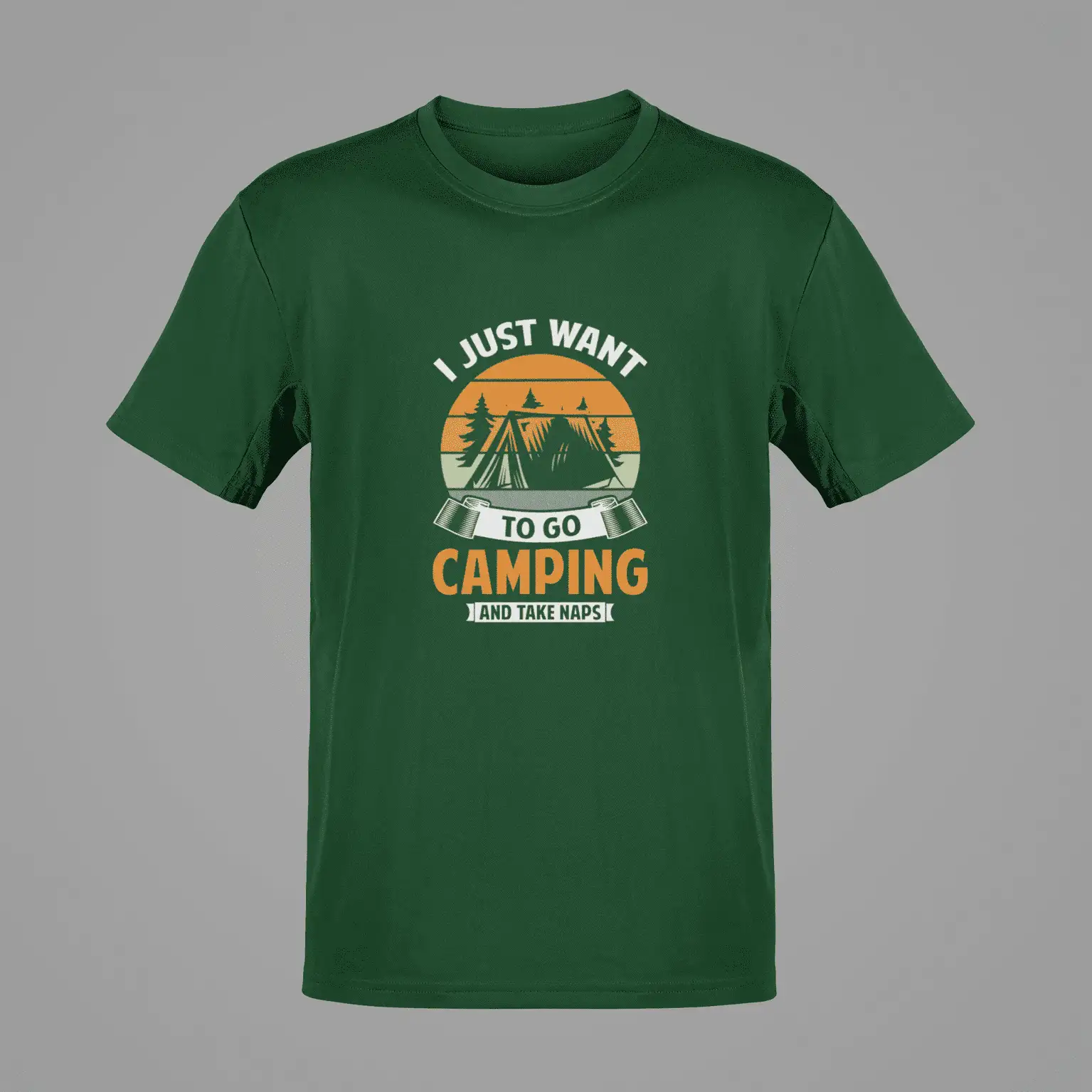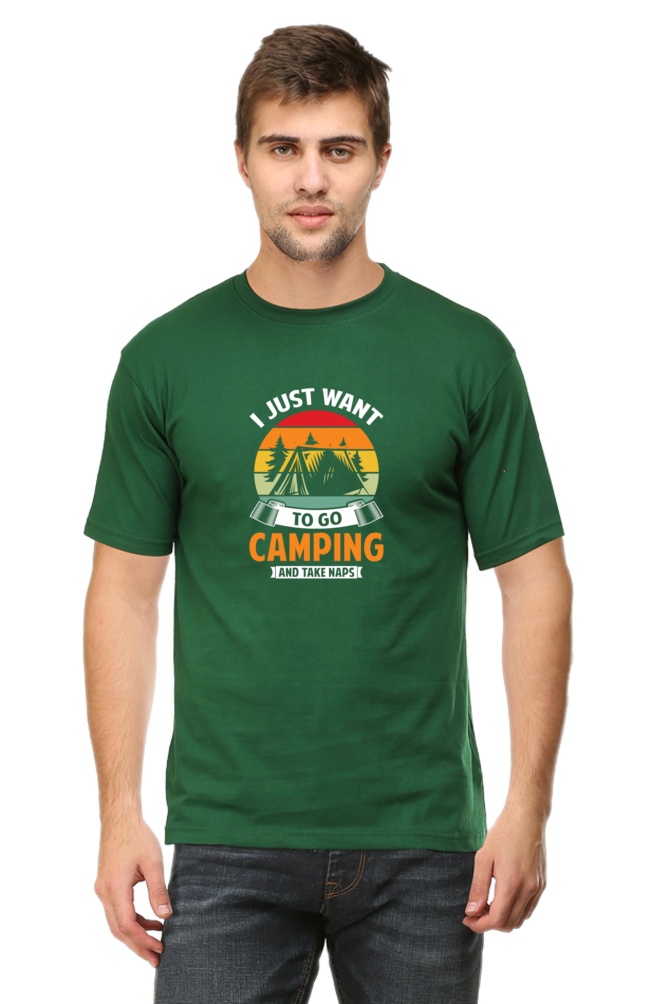 Find your chill under the stars with this bottle green classic crew neck t-shirt, featuring a retro-styled camping graphic that screams weekend vibes. Designed with a warm-toned vintage sunset, cozy tent illustration, and bold typography that reads “I Just Want to Go Camping and Take Naps” – this tee captures every camper’s dream in one laid-back design.