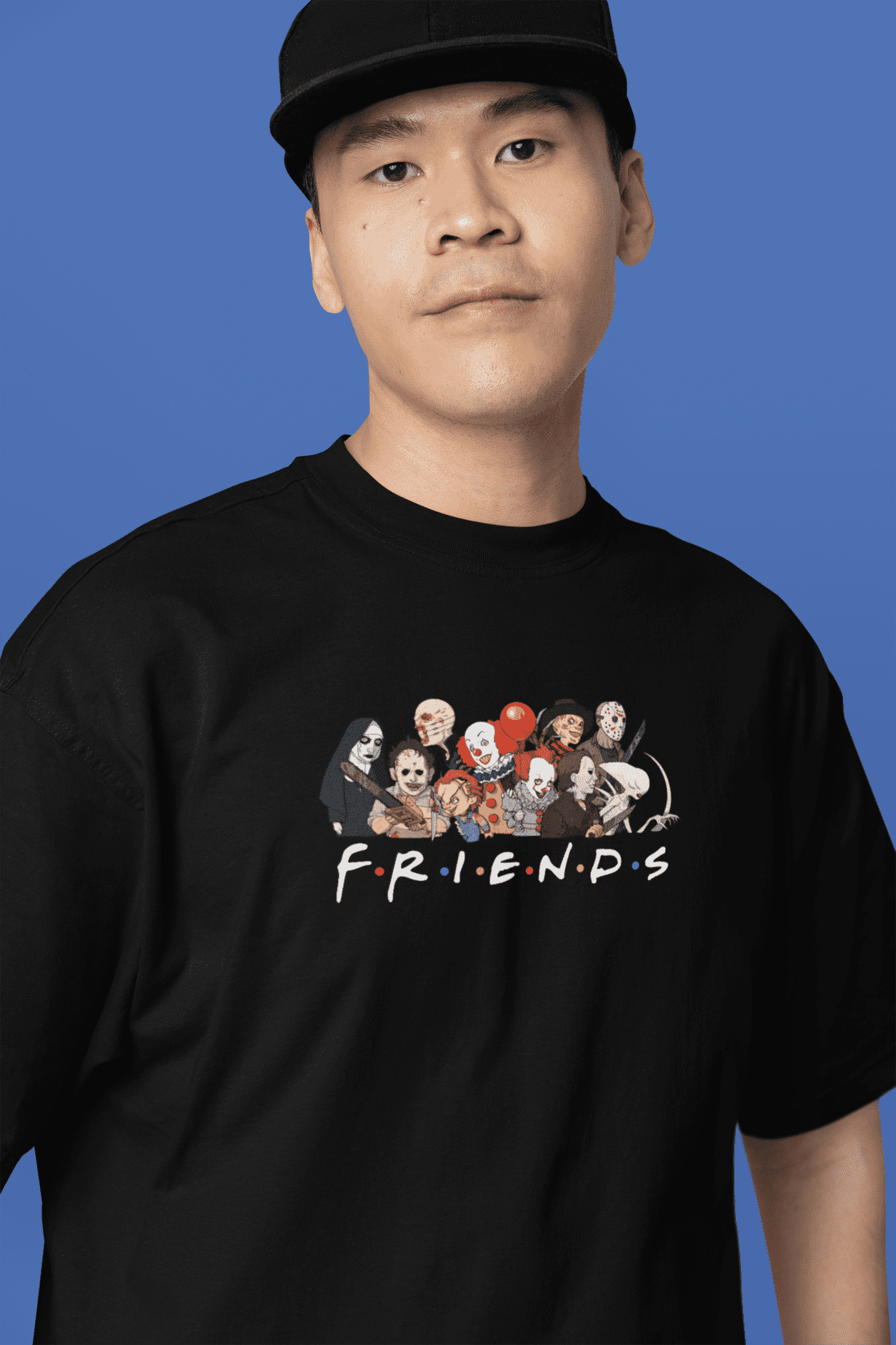 What if your favorite killers had a group chat? Enter the Horror Friends Oversized T-Shirt—a darkly comic take on pop culture’s most terrifying icons, all chilling together like they just left Central Perk. Printed in ultra-crisp DTF on a jet-black canvas, this design features legends like Pennywise, Chucky, Jason, Freddy, and more—reimagined with cartoon flair and just the right dose of disturbing charm.
