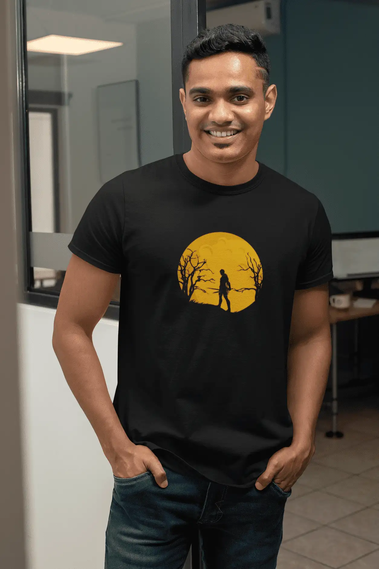 The design features the silhouette of a lone swordsman standing against a striking orange moon, framed by the bare branches of a haunted landscape. The layered crescents within the moon hint at mysterious realms and battles beyond this world, capturing a sense of both solitude and readiness.