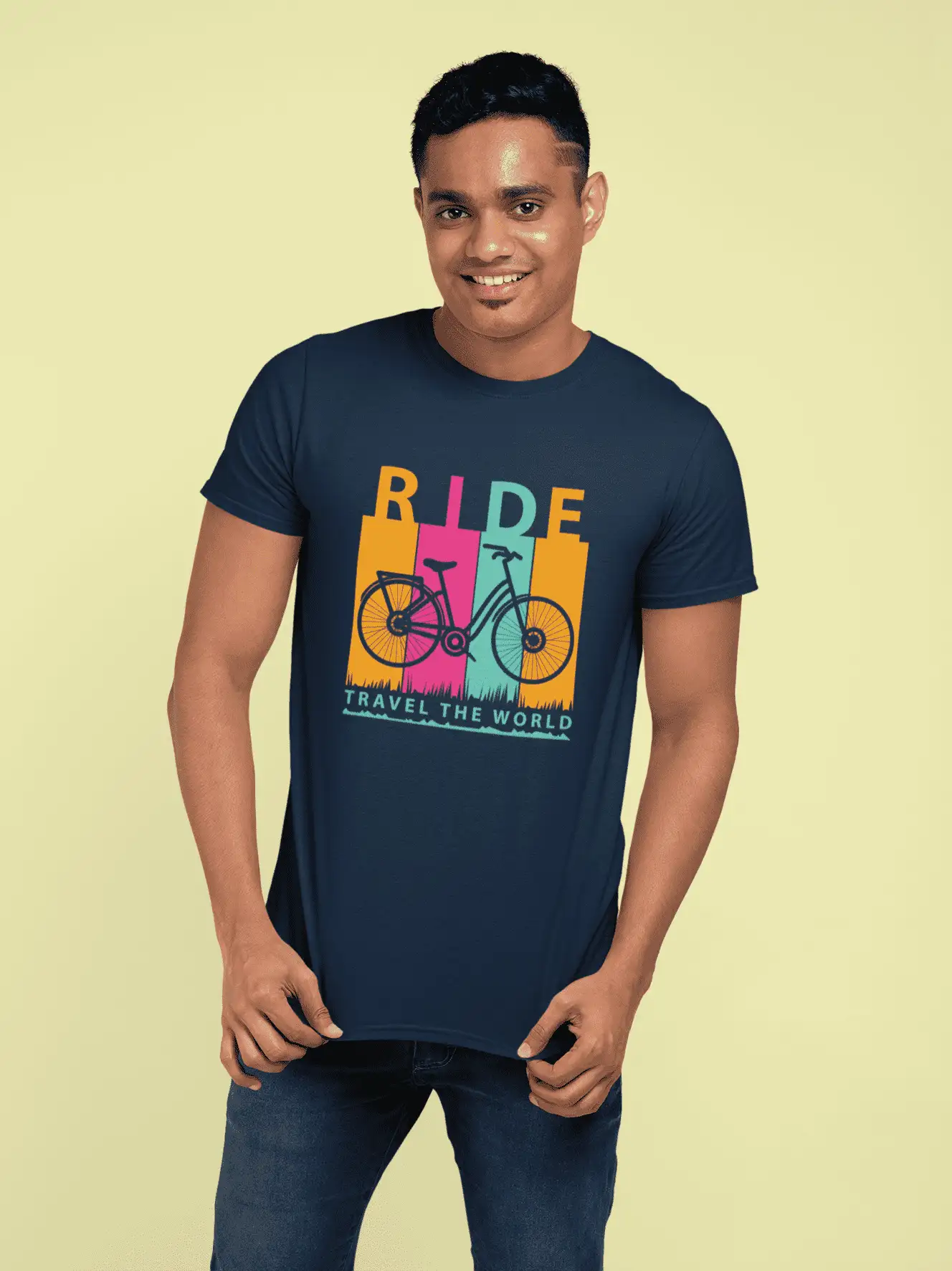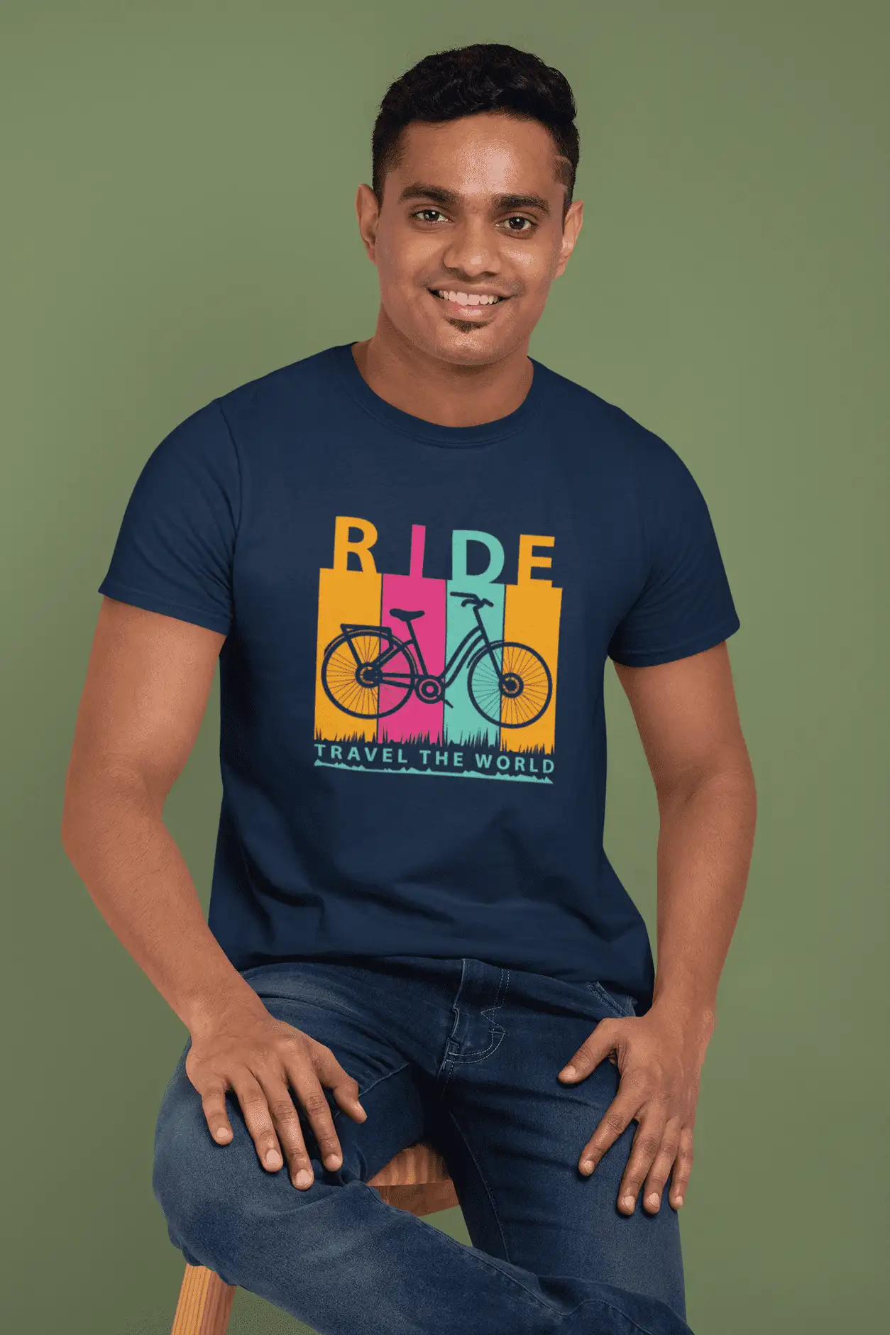 Adventure starts on two wheels. This navy crew neck tee features a vibrant silhouette of a classic bicycle framed in colorful vertical bars with bold typography that reads: “RIDE – Travel the World.” It’s a call to explore, pedal, and embrace the freedom of movement wherever the road takes you.