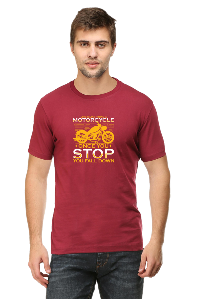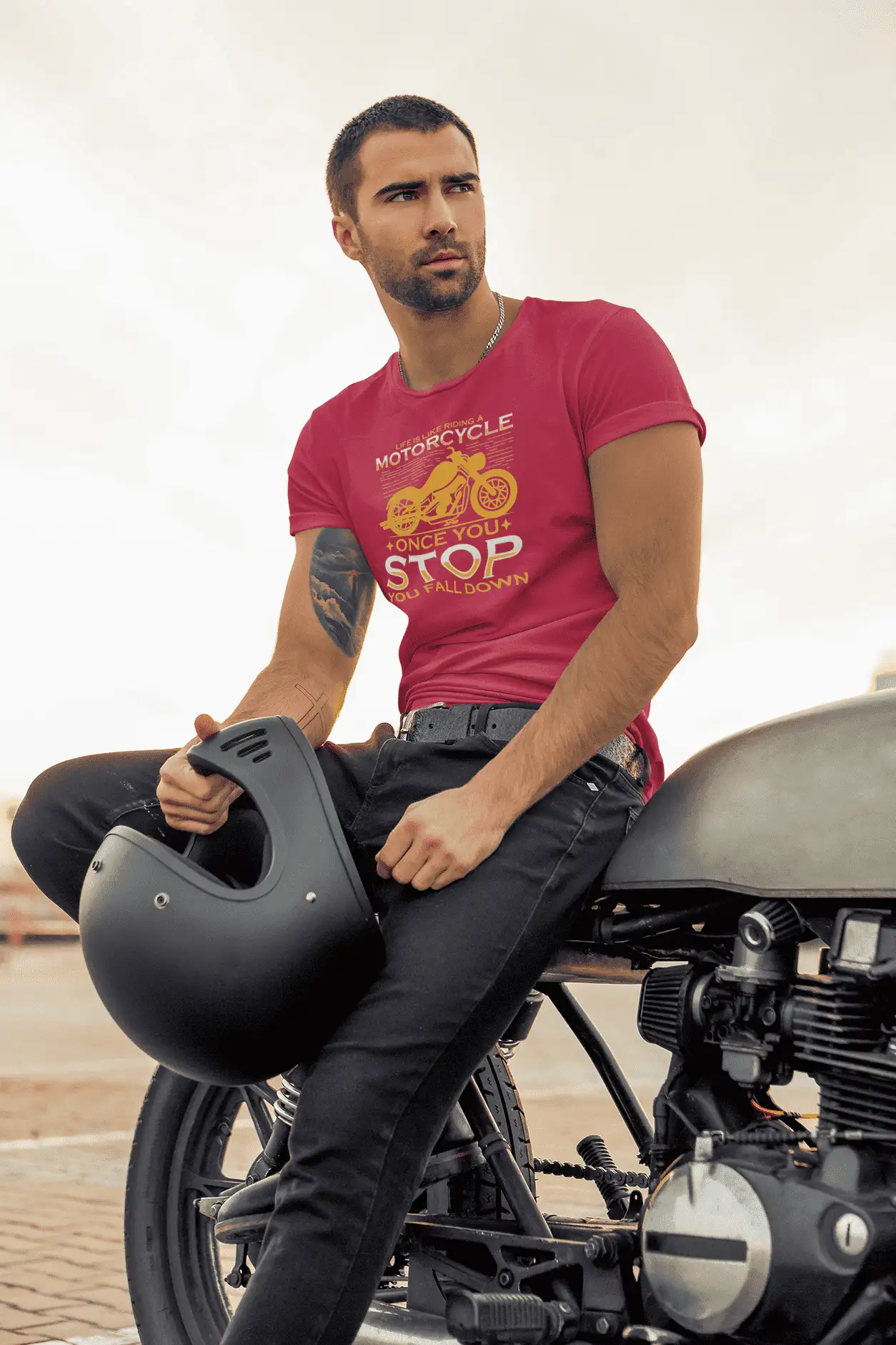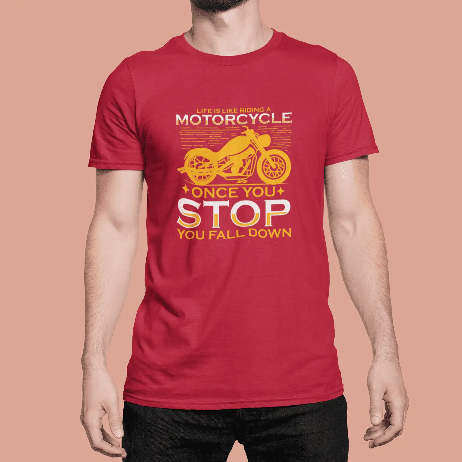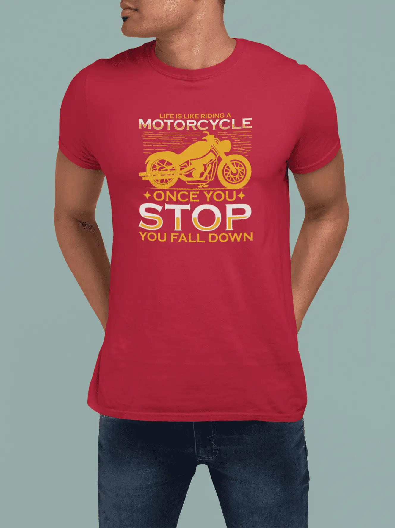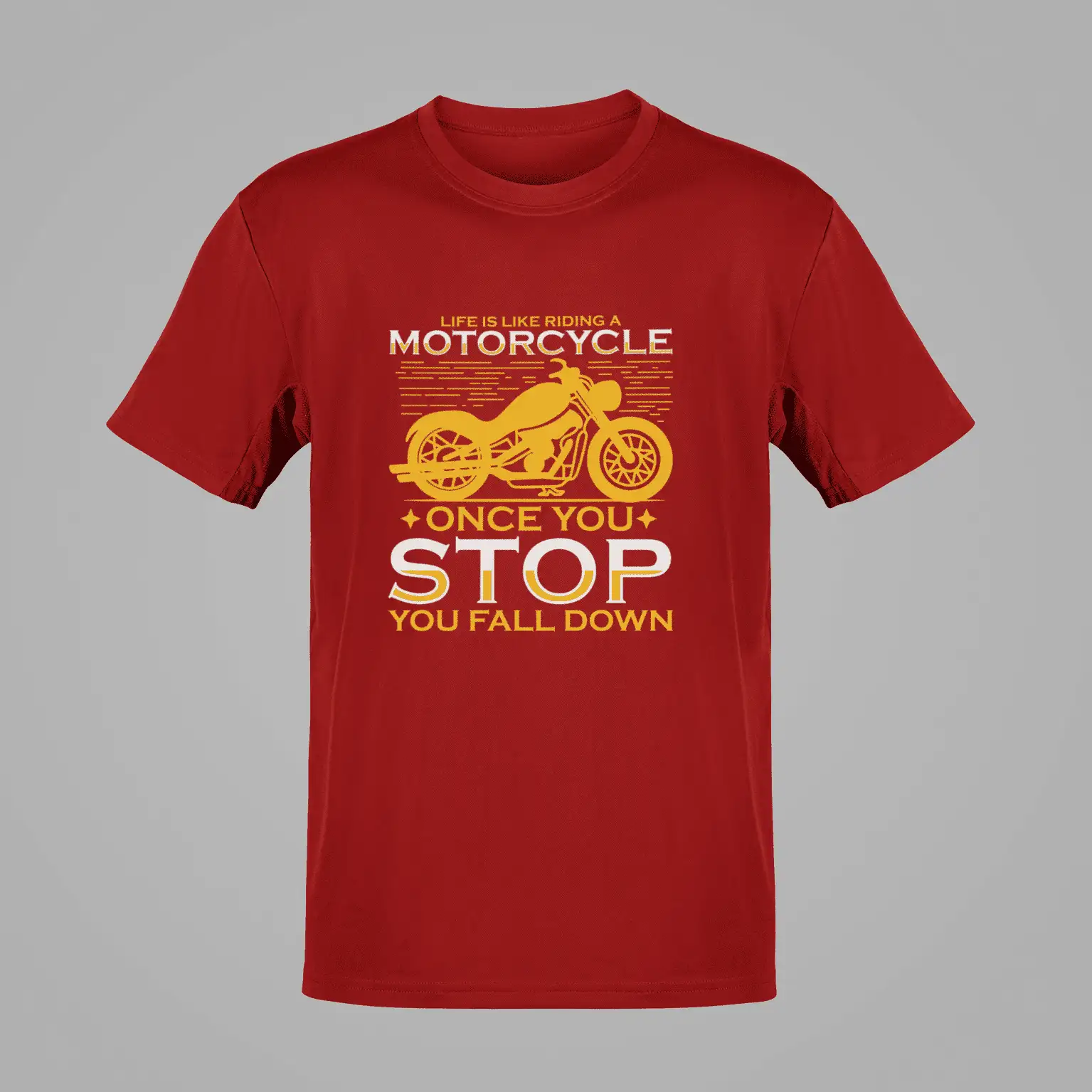 Fuel your passion for the ride with this eye-catching red classic-fit tee. Featuring a sleek golden motorcycle silhouette and the inspiring quote: