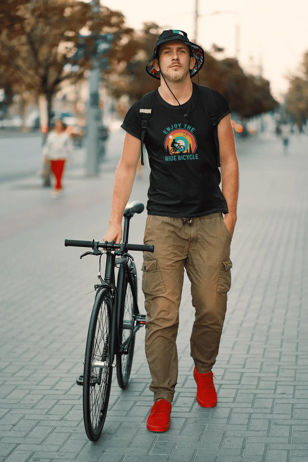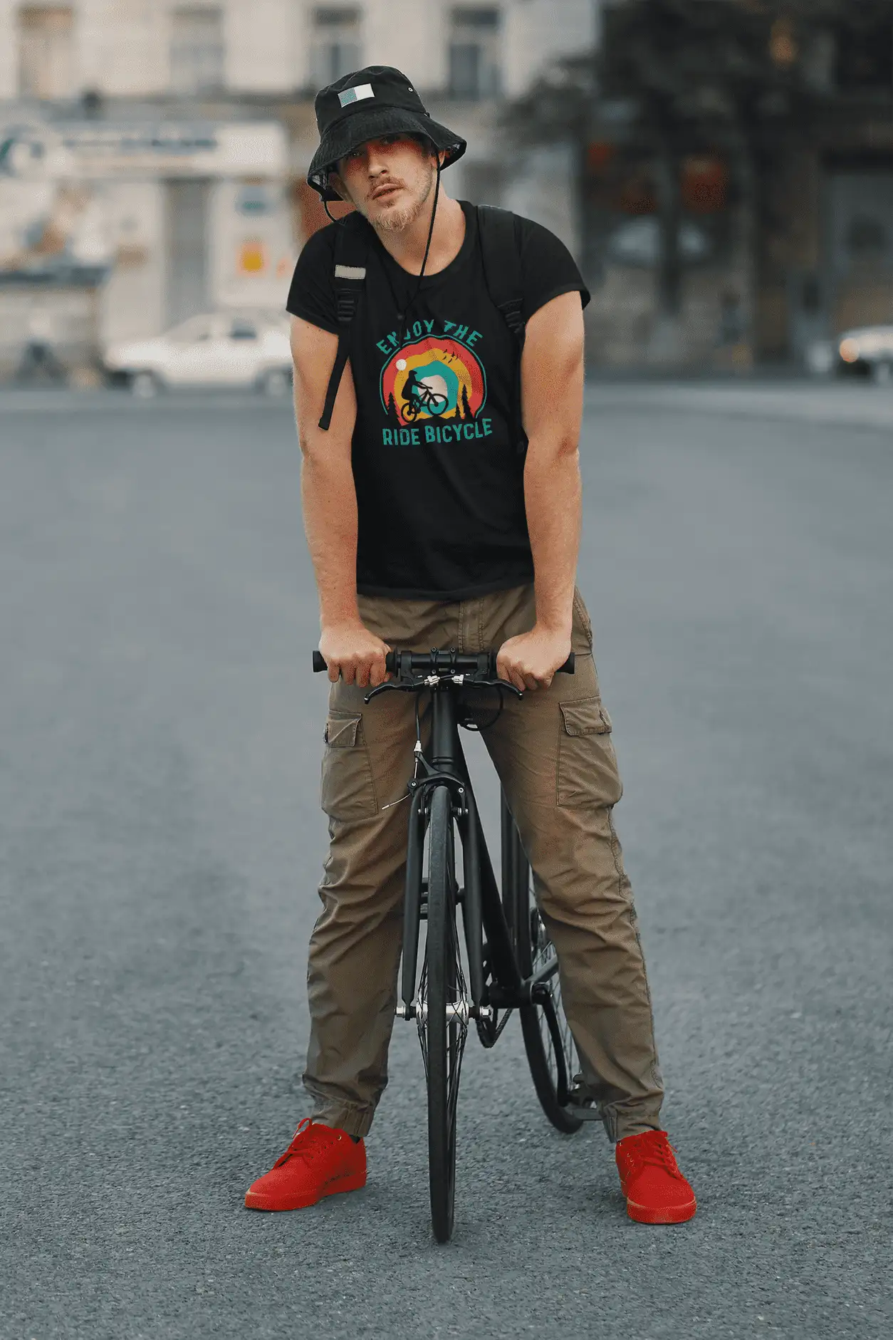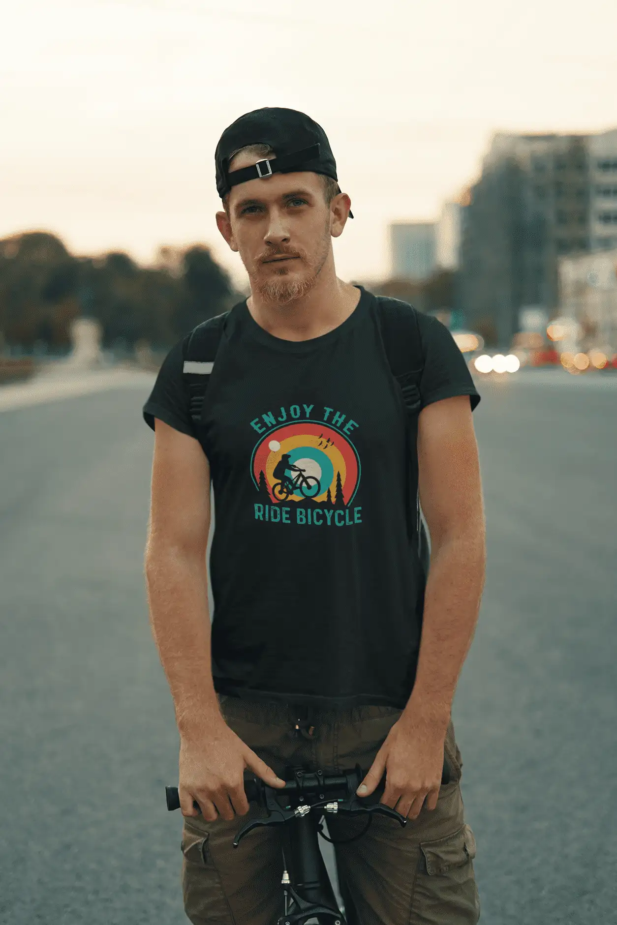 With a sunset-inspired retro palette—burnt orange, teal, mustard, and off-white—this graphic pops perfectly on a solid black tee, making it a great piece for outdoor lovers, cyclists, or anyone who enjoys the journey more than the destination.