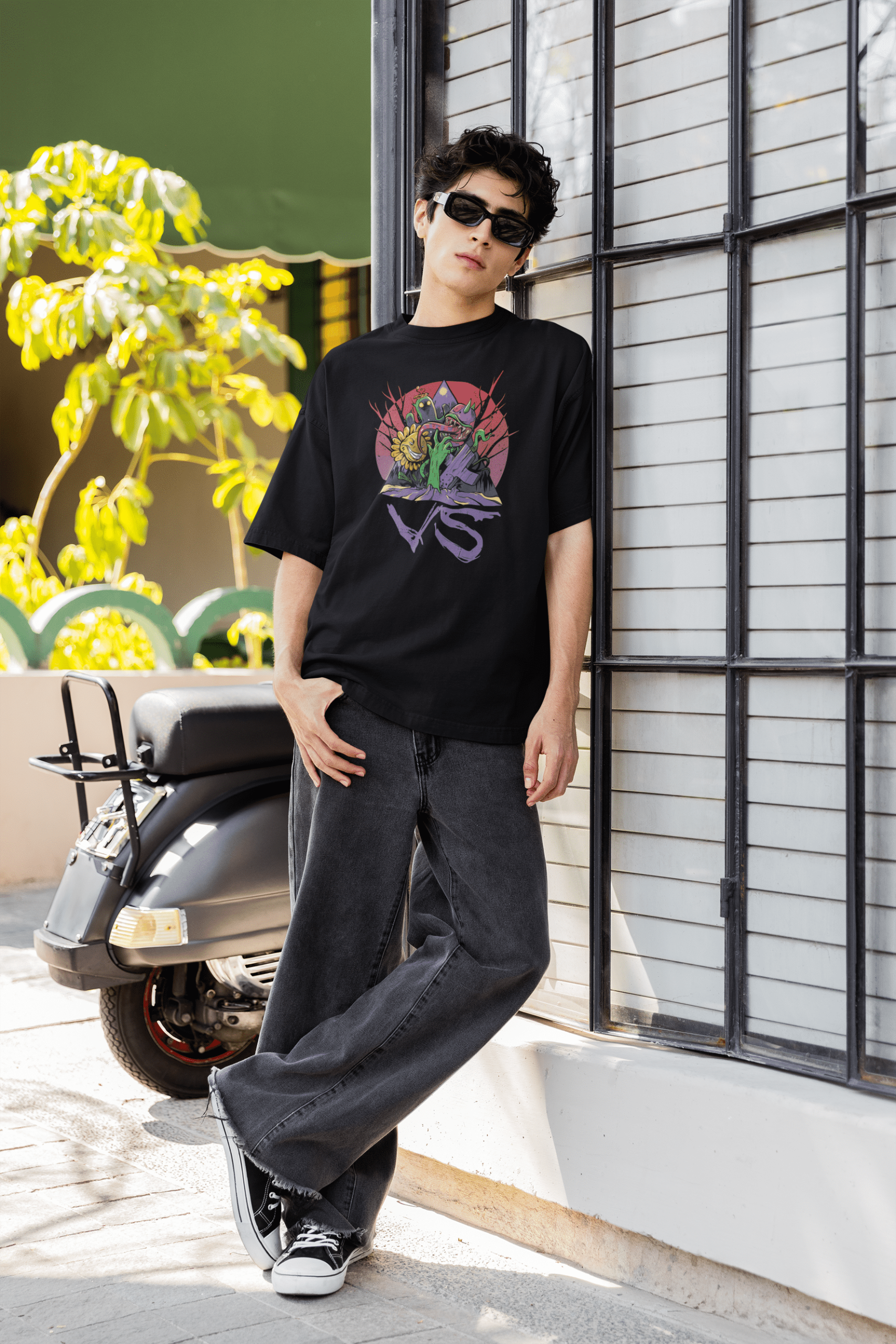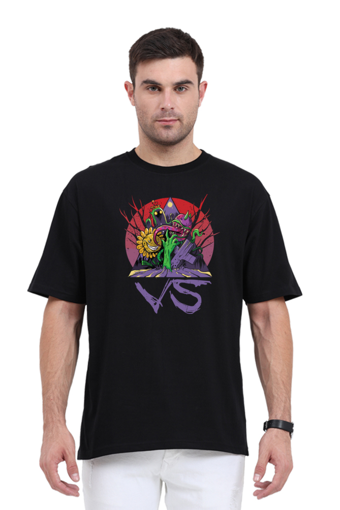 Brace yourself for a chaotic clash of creepy and cool with our Zombieminati Oversized T-Shirt in jet black. Featuring a vibrant DTF print, this design throws you into a twisted face-off between sinister sunflowers, carnivorous beasts, and lurking spirits—all set against a blood-red twilight backdrop. The hand-drawn “VS” at the bottom seals the vibe: this isn’t just a print, it’s a battle of bizarre forces.